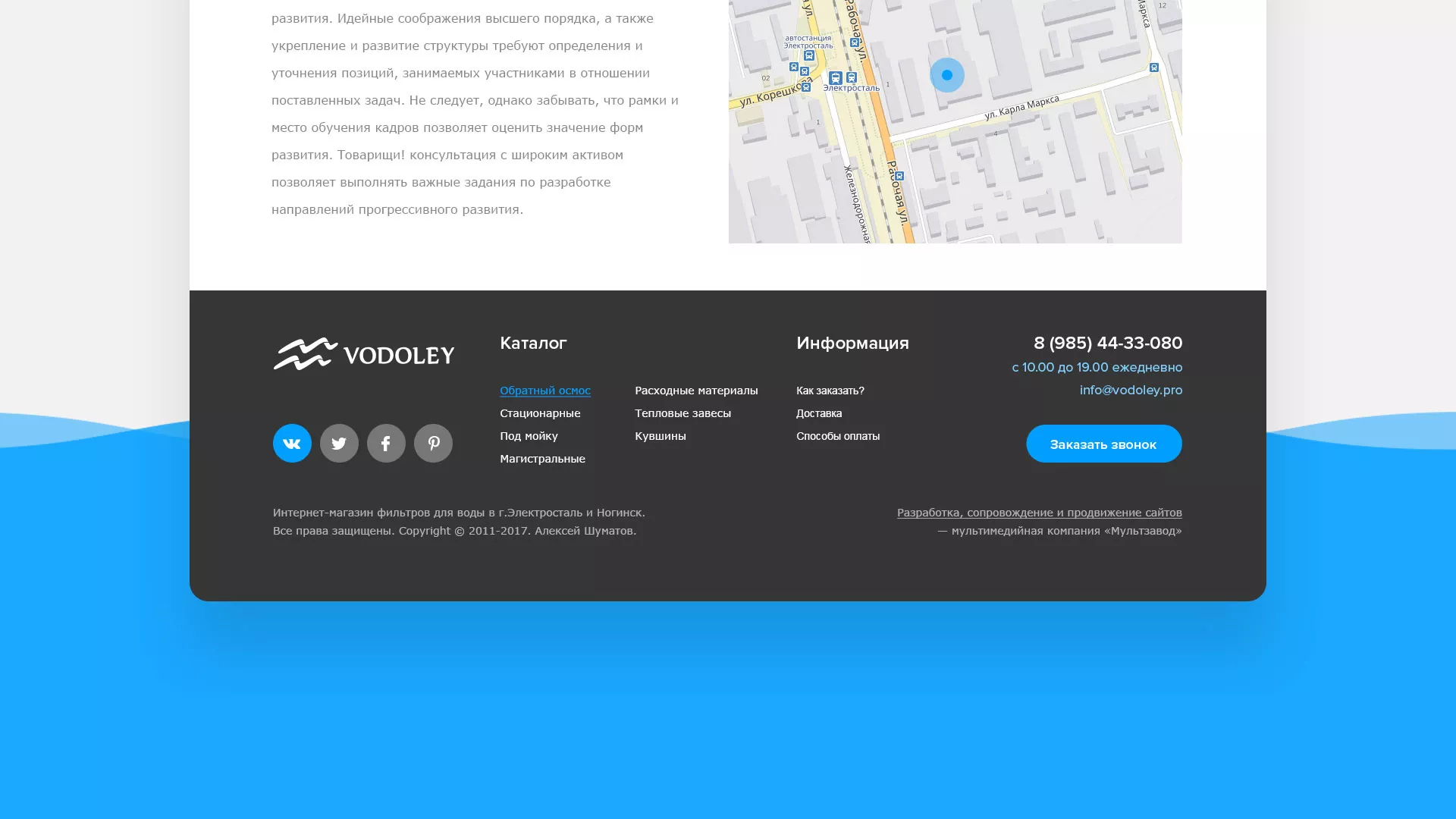 Работать с компанией «Мультзавод» удобно и легко, поэтому, если Вам требуется создание аналогичного сайта по продаже и установке фильтров очистных сооружений в Верхнеуральске, мы предложим Вам действительно выгодные цены и удобные условия сотрудничества. Мы обещаем, что вложенные в разработку сайта деньги окупятся и Вы получите современный рабочий интернет-магазин!